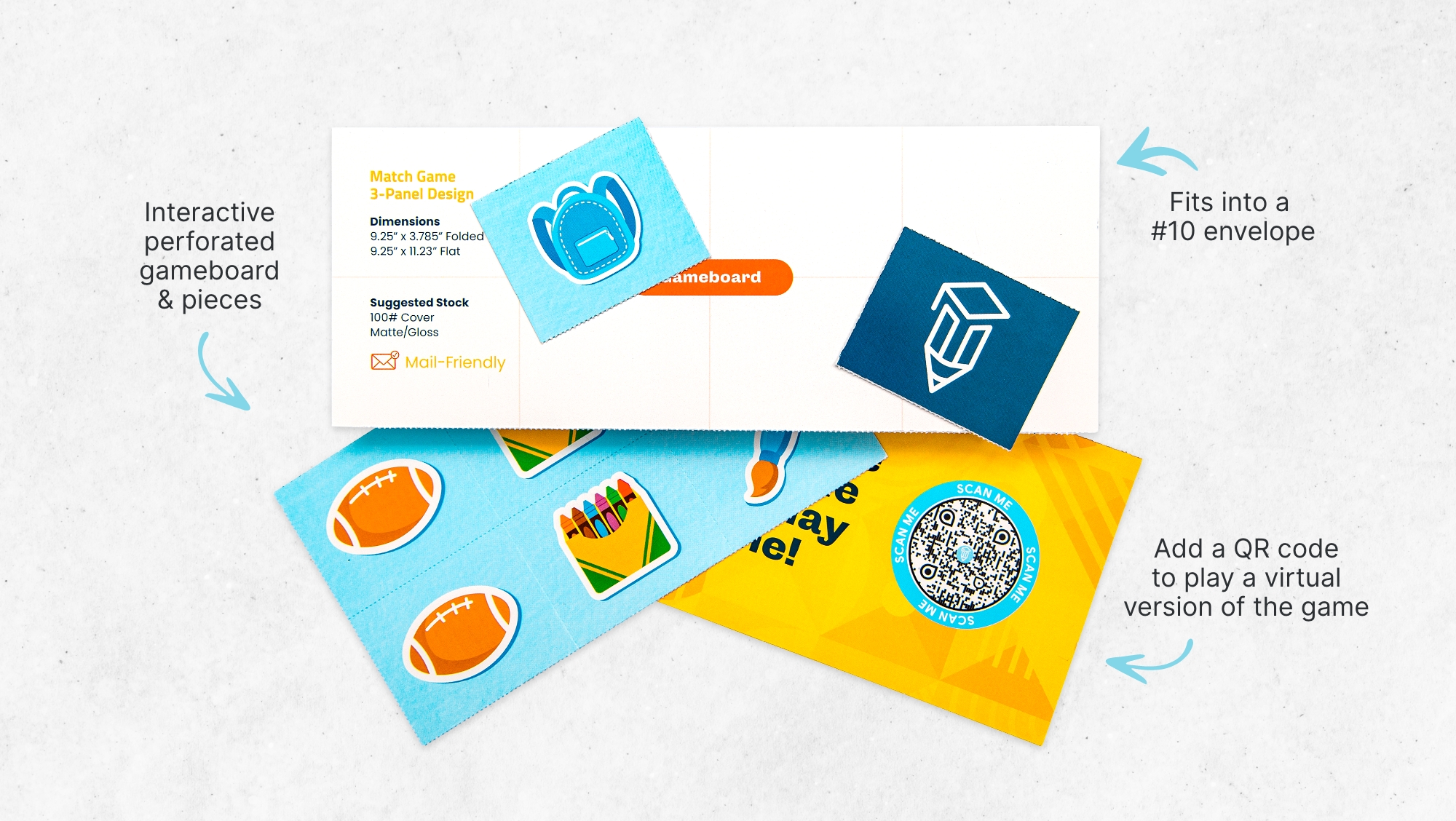 This interactive piece features a gameboard and perforated game cards—all of which can be branded to fit your mission and messaging. Recipients can learn about your impact by playing the game at home. An optional online game can be included by using a QR Code to a customized landing page complete with form fields and a CTA to drive donations, engage volunteers, promote events, and more.